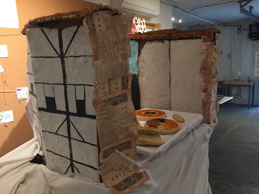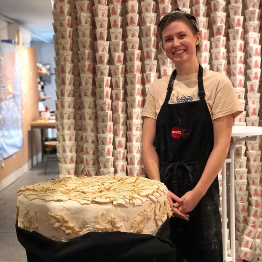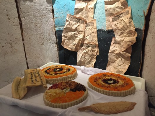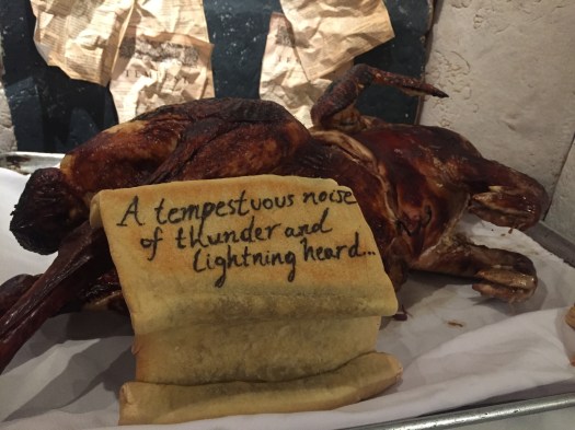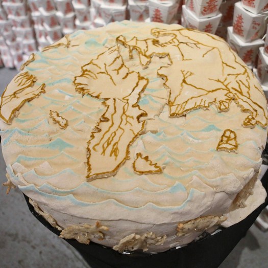 I was lucky enough to work with Jay on a handful of edible centerpieces for three dinners–“Feminist Food, Feminist History,” featuring a dough-and-pastillage St. Agatha, “Secrets of the Trade Winds,” where a fake “fish pie” shaped like a 15th-century map took center stage, and “A Tudor Feast,” with a dough replica of the Globe theater acting as home for a cockenthrice and some marzipan delicacies.